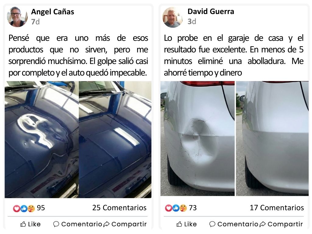 Mirta Pedreros RancaguaverificadaMe ahorré mucha plataFui a cotizar al taller por una abolladura chica y el precio era demasiado alto para algo tan simple. Compré DentSave Pro™ y lo arreglé en el garaje de mi casa no quedóo perfecto pero el ahorro fue enorme y el auto se ve muchísimo mejor